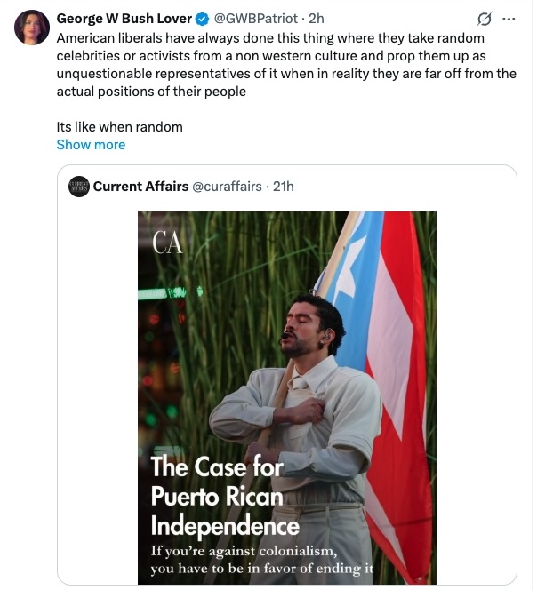 Many suggested that the Current Affairs author, who lives in a state, is demonstrating colonialism by attemtpting to force an unwanted political status on Puerto Rico.