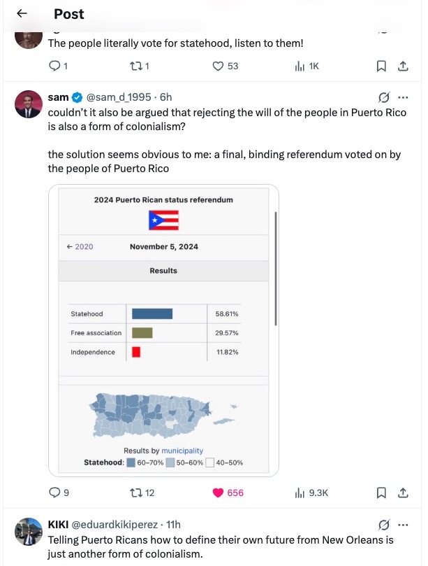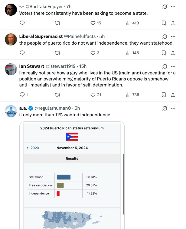 Numerous commenters made this point, often by showing the results of the most recent plebiscite. This one also makes the point that someone living in a state and advocating for a status that is contrary to the wishes of the people actually living on the Island is not a good example of support for self-determination.