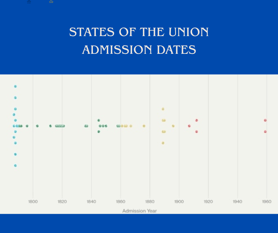 The United States will have its 250th birthday this year. For most of our history, we added states regularly. The chart below shows how we began with 13 original states, the 13 British colonies that became the United States, and then added more states. They joined briskly in the 18th and 19th centuries, slowed down in the 20th century, and stopped entirely in the 21st.