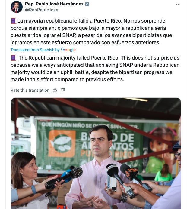 The Senate and the House will have to agree on the Farm Bill to get it passed. Their inability to do this is the reason that the 2018 Farm Bill is still in force. Blaming the failure of NAP-to-SNAP on the Republicans continues the polarization that keeps Congress from making bills into law. The real problem is Puerto Rico’s territory status. The real solution in statehood. Reach out to your elected representatives and make sure they know that Puerto Rico is ready for the full rights and responsibilities of statehood.